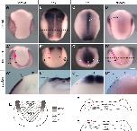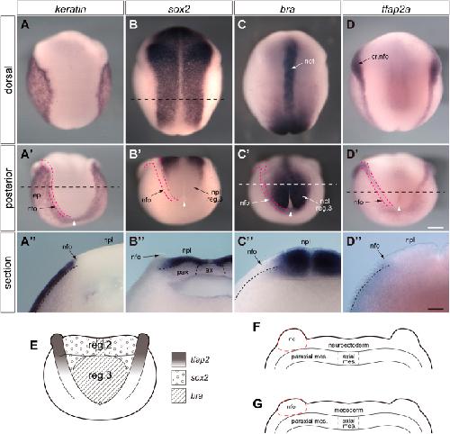 Figure 6. Expression of molecular markers for epidermis, mesoderm, and neural crest.In situ hybridization of axolotl neurulae (stage 15) with keratin (A, Aâ), sox2 (B, Bâ and Bâ), brachyury (C, Câ and Câ) and tfap2a (D, Dâ and Dâ) riboprobes. AâD, dorsal views of whole embryos. AââDâ, posterior views of whole embryos. AââDâ, posterior aspects of anterior halves of bisected embryos. Sectioning planes are indicated by dashed lines and run through the middle of region 3 fold/plate (Aâ, Câ and Dâ) or through region 2 (B). Red double-dashed lines indicate neural folds; prospective epidermis is lateral and neural plate medial to the folds. E, fate of plate/fold region3 based on in situ hybridization with brachyury (bra), sox2 and tfap2a riboprobes (neurula stage 15). Brachyury: positive in the centre of plate region 3; tfap2a: positive.in cranial and trunk neural folds until the anterior part of fold region 3; sox2: positive in cranial and region 2 plate. F and G, transverse sections through neural fold/plate (stage 15) in region 1â2 (F) and middle of region3 (G). Axial differences of neural plate and neural crest potential become evident (neuroectoderm vs. mesoderm and neural crest vs. neural fold, respectively). These data and the indication of the distribution of the tfap2-, sox2- and bra-zones in E are based on in situ hybridization (see above). nc in F, prospective neural crest; nfo in G, tfap2a-negative neural fold tissue, probably mesoderm. Number of experiments: about 20 for each riboprobe. White arrowheads in Aâ-Dâ point to blastopore. Abbreviations: not, notochord; nfo, neural fold; cr. nfo, cranial neurl fold; npl, neural plate; ax, axial mesoderm; pax, paraxial mesoderm. Scale bars, 500âμm (Dâ) and 200âμm (Dâ). |