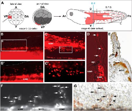 Figure 8. Descendants from blastomere C4 form fin mesenchyme in Xenopus laevis.A, Schematic of the experiment. At the 32-cell stage one C4 blastomere was labelled by microinjection of ruby-dextran. At stage 40 the labelling can be found in somites, in the posterior part of the intestine, in the blood and in the fin. The squares indicate the areas displayed in B,C,F,G. The vertical line indicates the cutting planes in D and E. B,BâC,Câ, Groups of labelled cells migrate from the somites to the dorsal (B,Bâ) and ventral fin (C,Câ). Squares in B and C indicate the regions displayed in Bâ and Câ at higher magnification. D, Transversal section through posterior trunk with labelled somite (som) and fin mesenchymal cells (arrows); overlay of dextran-fluorescence and phase-contrast image. E, Transversal vibratome section through posterior trunk with labelled somite (som) and with a labelled fin mesenchyme cell (arrow). DAB-peroxidase staining using the biotin-residues of the ruby-dextran tracer. FâG, Fin mesenchyme cells (arrows) at higher magnification; F, dextran fluorescence; G, after DAB-peroxidase staining. Abbreviations: A, animal; V, vegetal; DA, dorsoanterior; VP, ventroposterior; An, anterior; D, dorsal; Po, posterior; V, ventral; epi; epidermis; som, somite; Number of cases: 65 |
