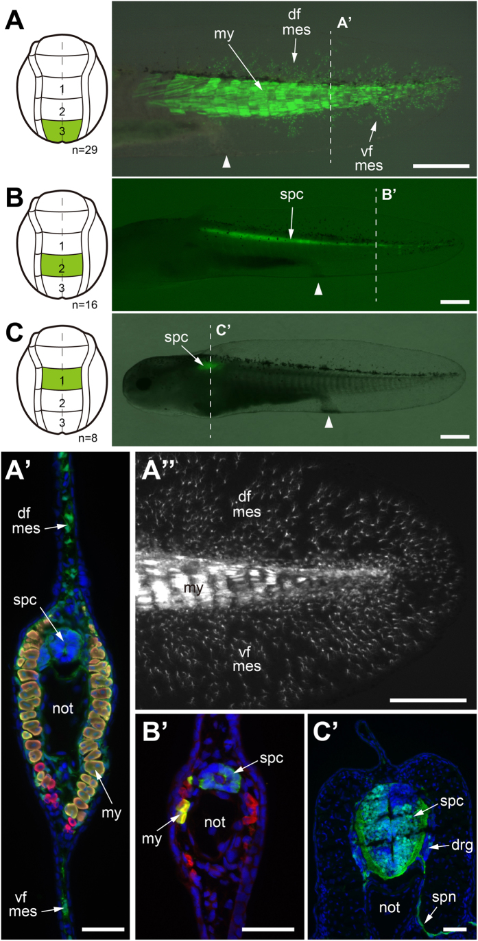 Figure 2. Results of fate mapping experiments of neural plate in the axolotl neurula (stage 15).Only posterior trunk neural plate regions contribute to posterior trunk/tail muscle and fin mesenchyme. A–C, homotopic transplantation of three defined GFP+ neural plate regions (accentuated in green) from a GFP+ donor (stage 15) to a white (d/d) host (stage 15) and visualization of graft-derived GFP+ cells in larvae at stage 41 (1 cm length). White arrowhead indicates position of cloaca in larvae. A’–C’, transverse cryosections through larvae shown in A–C containing GFP+ grafts; dashed lines in A–C indicate sectioning planes; sections are overlays of fluorescence images. Dapi, blue; anti-12/101 (muscle), red; anti-GFP, green. A and A’, GFP+ region3 plate gives rise to most myotome cells in the tail and posterior trunk and to mesenchymal cells of the dorsal and ventral tailfin (faintly visble). B and B’, GFP+ region2 plate gives rise to some cells in the spinal cord and tail myotomes. C and C’, GFP+ region1 plate contributes to cells in the spinal cord of the anterior trunk. A”, enlargement of tailfin for visualizing mesenchymal cells (mes) in the dorsal (df) and ventral tailfin (vf); animal different from that in A. Number of experiments: A, 29; B, 16; C, 8. Abbreviations: df, dorsal fin; vf; ventral fin; mes; mesenchymal cell; my, myotome; spc, spinal cord; not, notochord; drg, dorsal root ganglia; spn, spinal nerve. Scale bars, 1 mm (A–C), 100 μm (A’–C’) and 500 μm (A”). |