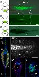 Figure 3. Results of fate mapping experiments of neural fold in the axolotl neurula (stage 15).Only posterior trunk neural fold regions contribute to posterior trunk/tail muscle and fin mesenchyme. A-C, homotopic transplantation of three defined GFP+ neural fold regions (accentuated in green) from a GFP+ donor (stage 15) to a white (d/d) host (stage 15) and visualization of graft-derived GFP+ cells in larvae at stage 41 (1 cm length). White arrowheads indicates position of cloaca in larvae. A’–C’ and A”, transverse cryosections through larvae shown in A–C containing GFP+ grafts; dashed lines in A–C indicate sectioning planes; sections are overlays of fluorescence images. Dapi, blue; anti-12/101 (muscle), red; anti-GFP, green. A, A’ and A”, GFP+ region3 fold gives rise to few muscle cells in tail myotomes, to few mesenchymal cells in the dorsal and ventral tailfin and to some tail epidermis (upper and lower seam of tailfin). B and B’, GFP+ region2 fold contributes cells to the spinal cord, dorsal root ganglia and fin epidermis in the mid trunk. The labelling of the epidermis is not visible here in B‘ but optimal further posteriorly to the ganglia (see Fig. S1). C and C’, GFP+ region1 gives rise to cells in the spinal cord, dorsal root ganglia, fin epidermis and to the middle lateral line nerve in the anterior trunk. D–F, higher enlargements of boxed area in A’. Presence of GFP+ mesenchymal cells in the dorsal tailfin after grafting GFP+ fold region3. Number of experiments: A, 30; B, 5; C, 5. Abbreviations: df, dorsal tail fin; vf: ventral fin; mes: mesenchymal cell; my, myotome; epi, epidermis; spc, spinal cord; lln, lateral line nerve; drg, dorsal root ganglia; spn, spinal nerve; not, notochord. Scale bars, 1 mm (A–C), 200 μm (A’), 20 μm (F) and 100 μm (A”, B’, C’). |