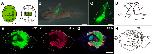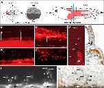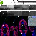 Figure 7. Grafted single GFP+ neural fold reg3 cells reveal mesodermal but no pigment cell traits in the host tailfin.A, Schematic of experimental procedure. Single neural fold cells were isolated from a dorsal neural fold explant (left middle to posterior region3) of a GFP+ donor (stage 15) and grafted homotopically into a white host (stage 15). B, summary of experimental results; frequency of GFP+ cells in tail tissues of host larvae (stage 41, 1 cm); tissues: mus, muscle; fin mes, fin mesenchyme; ct, connective tissue; epi, epidermis. C–G, types and frequency of GFP+ tissues that had developed from a single grafted neural fold region3 GFP+ cell in tail regions of living axolotl hosts (stage 41, 1 cm); bright field/FITC. C’–G’, higher enlargements of boxed areas in C–G. C and C’, only muscle cells (39%); D and D’: muscle and fin mesenchyme cells (16%); E and E‘: muscle and connective tissue (8%); as the connective tissue is located inside the larva it is dim and insharp in wholemount images; F and F’: only fin mesenchyme (12%); G and G’: epidermis (22%). H and L, Transverse sections through tails of larvae shown in D and E, respectively. I–K, higher enlargement of GFP+ fin mesenchymal and muscle cells from H. M–N, higher enlargement of connective tissue (M) and muscle cells (N) from L . H–L and N, merged images of GFP, 12/101 (red) and Dapi. M, merged image of GFP, bright field and dapi. Scale bars, 200 μm (H and L) and 50 μm (K and N). I–K and M–N have the same magnification. |