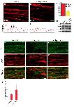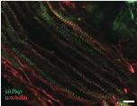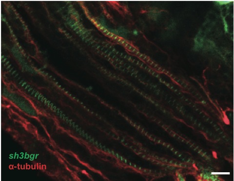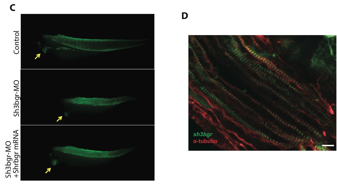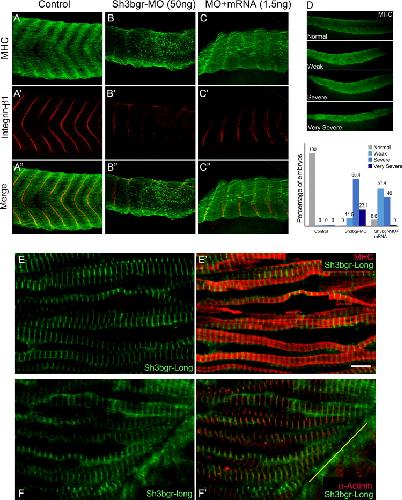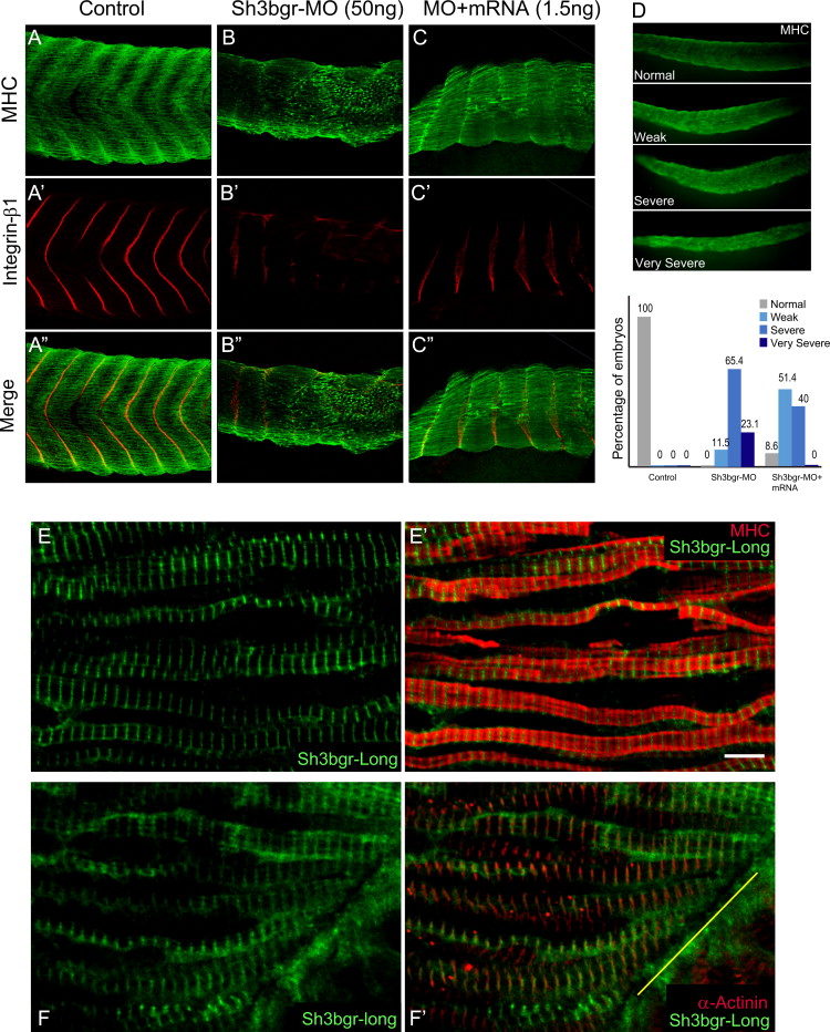 Fig. 2. Knockdown of sh3bgr caused severe defects in somite development. AâC. Microinjection of sh3bgr antisense morpholino (Sh3bgr-MO; 50 ng per embryo) disrupted normal somite development. The somite boundaries were labeled with anti-integrin-β1 antibody (Red) and the muscle fibers were stained with the myosin heavy chain (MHC) antibody (Green) at Stage 33. D. The muscle phenotypes were categorized according to the severity. Weak; the chevron pattern is partially disrupted, Severe; the chevron pattern is completely lost. Very severe; the somatic tissue is severely hypomorphic. The muscle defects in the morphants were recovered by co-injection with 1.5 ng of sh3bgr mRNA. The numbers in the graph are the percentage of the embryos. The numbers of embryos analyzed: Control-13, sh3bgr morphants-26, Rescue-35. E-Eâ. Sh3bgr localizes to the muscle fibers. 150ng of Sh3bgr-flag mRNA was injected into Stage 2 embryos. Stage 33 embryos were fixed and the coronal sections of somitic tissues were stained for MHC (Red) and Sh3bgr-flag (Green). FâFâ. Sh3bgr-flag fusion protein localized to the Z-line in sarcomeres. Sh3bgr-flag (Green) was co-immunostained with α-actinin (Red). The yellow line indicates a somitic boundary. Scale bar = 5 µm |