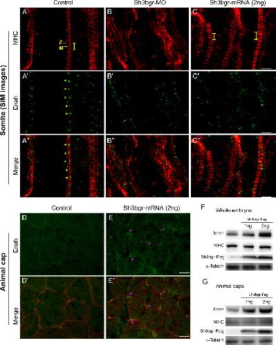 Fig. 5. Sh3bgr is an upstream regulator of Enah. AâC. Super resolution SIM images of sarcomeres in control (A) Sh3bgr knockdown (B), and Sh3bgr overexpressing embryos (C). Enah protein was labeled in green and MHC was labeled in red. The Z-line and M-band are indicated within a sarcomere. Both knockdown and overexpression of Sh3bgr delocalize Enah from the Z-lines. DâE. Enah staining in control (D) and Sh3bgr overexpressing (E) animal cap cells. In Sh3bgr overexpressing animal cap cells, the Enah protein is highly enriched in tri-junctional foci (asterisk). FâG. The western blot analysis showed that the endogenous Enah protein level was sharply increased in whole embryos (F) or animal cap tissues (G) upon overexpression of Sh3bgr. Scale bar (AâC) = 2µm Scale bar (D, E) = 10 µm. |