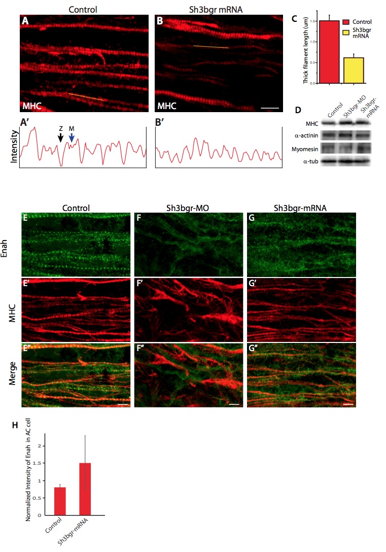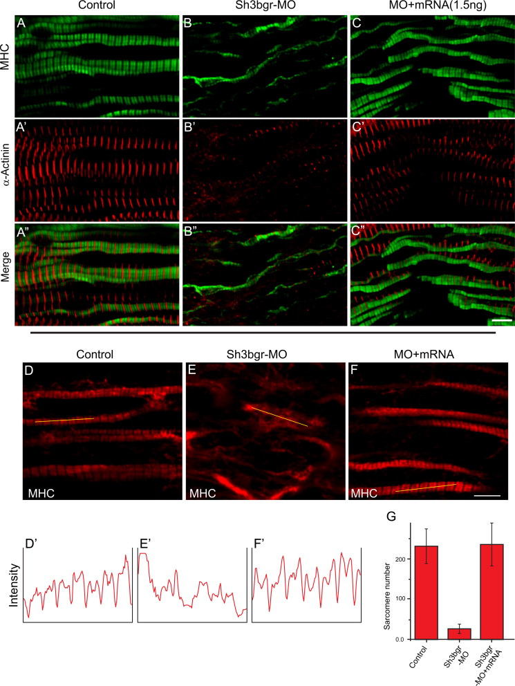 Fig. 3. sh3bgr is necessary for sarcomere formation. AâC. Stage 33 embryos were fixed and the coronal sections of somitic tissues were stained for α-actinin (Red) and MHC (Green). Knockdown of sh3bgr caused severe defects in the sarcomeres. Sh3bgr knockdown caused almost compete loss of sarcomere structures (B). Co-injection of Sh3bgr mRNA (1.5ng) with Sh3bgr-MO rescued sarcomere defects (C). DâF. Representative images of thick filaments. The fluorescent intensity plots of indicated muscle fibers are shown in (DââFâ). The average numbers of intact sarcomeres in each sample are shown in (G). Scale bar = 5 µm |