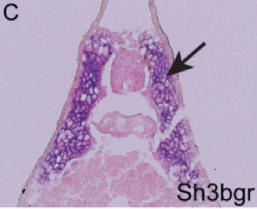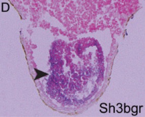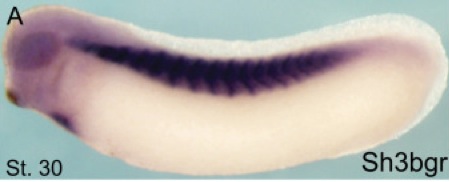 sh3bgr (SH3 domain binding glutamate-rich protein) gene expression in Xenopus laevis embryo, assayed via in situ hybridization, NF stage 30, lateral view, anterior left, dorsal up. |