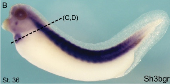 sh3bgrl (SH3 domain binding glutamate-rich protein like) gene expression in Xenopus laevis embryo, assayed via in situ hybridization, NF stage 32, lateral view, anterior left, dorsal up.