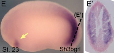 sh3bgrl (SH3 domain binding glutamate-rich protein like) gene expression in Xenopus laevis embryo, assayed via in situ hybridization, NF stage 23, lateral view, anterior right, dorsal up (E) and section through tail bud region (E'), dorsal up. |