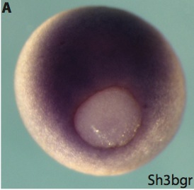 sh3bgr (SH3 domain binding glutamate-rich protein) gene expression in Xenopus laevis embryo, assayed via in situ hybridization, NF stage 11, blastoporal view, dorsal up. |