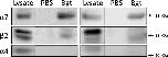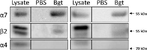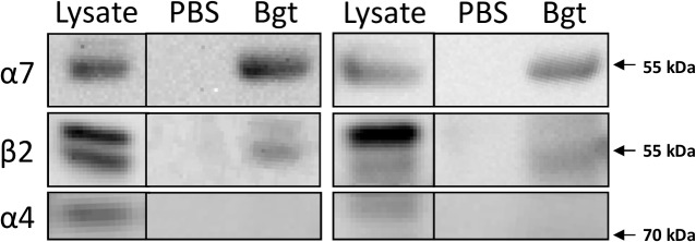 Fig 2. α7-containing nAChRs form heteromers with β2 nAChR subunits in human cortex.Magnetic beads covalently coupled with α-bungarotoxin (α-Bgt) or uncoupled beads (PBS) were incubated with homogenates from human temporal cortex (two separate identical experiments are shown) and the isolated proteins were separated using gel electrophoresis. Subsequent detection Western blotting demonstrated the presence of the α7 and β2 from samples isolated using α-Bgt-coupled, but not uncoupled beads. The α4 subunit was not detected in any of the isolates, confirming that the presence of β2 protein is not due to non-specific isolation of α4β2 nAChRs.