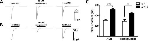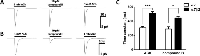 Fig 3. Responses of human α7 and α7β2 nAChRs to the nAChR agonists acetylcholine (ACh) and compound B in Xenopus oocytes.A) 1 mM ACh and 100 mM compound B evoke rapidly activating and desensitizing inward currents in oocytes expressing human α7 nAChRs. B) 1 mM ACh and 100 μM compound B evoke rapidly activating and desensitizing inward currents in oocytes expressing human α7β2 (1:10) nAChRs. C) Time constants for the decay phases of the responses to ACh (n = 6) and compound B (n = 3) for α7 and α7β2 nAChRs when fitted to a mono-exponential function. *** P<0.001 and * P<0.05 indicates significant difference in an unpaired t-test.