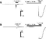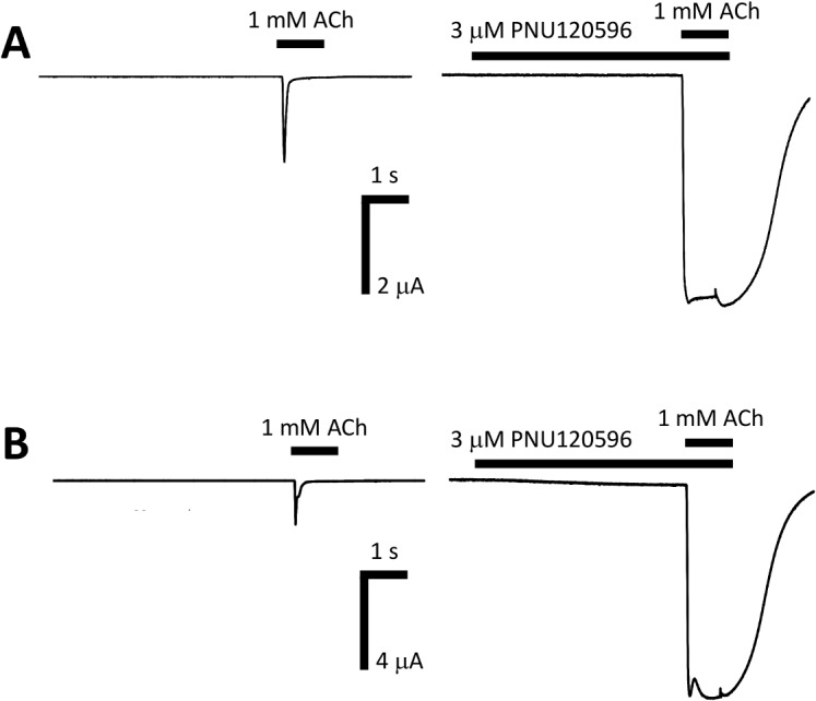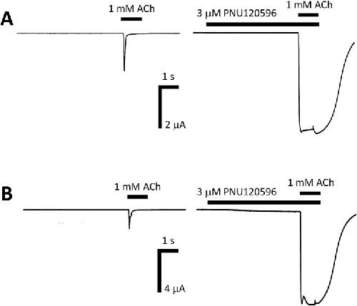 Fig 6. Potentiation of human α7 and α7eβ2 nAChRs in Xenopus oocytes by the allosteric potentiator PNU120596.A) A control response was evoked by applying 1 mM ACh to an α7 nAChR expressing oocyte. After a 3 min wash period 3 μM PNU120596 was applied to the same oocyte and after 1 min PNU120596 was co-applied with 1 mM ACh. In the presence of PNU120596 the peak of the 1 mM ACh-induced response was largely potentiated. B) A control response was evoked by applying 1 mM ACh to an α7β2 nAChR expressing oocyte. After a 3 min wash period 3 μM PNU120596 was applied to the same oocyte and after 1 min PNU120596 was co-applied with 1 mM ACh. In the presence of PNU120596 the peak of the 1 mM ACh response was largely potentiated.