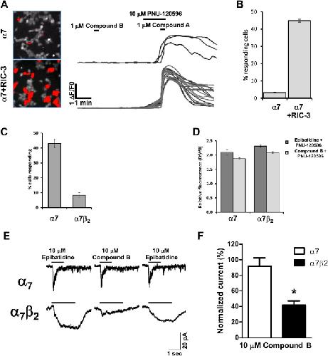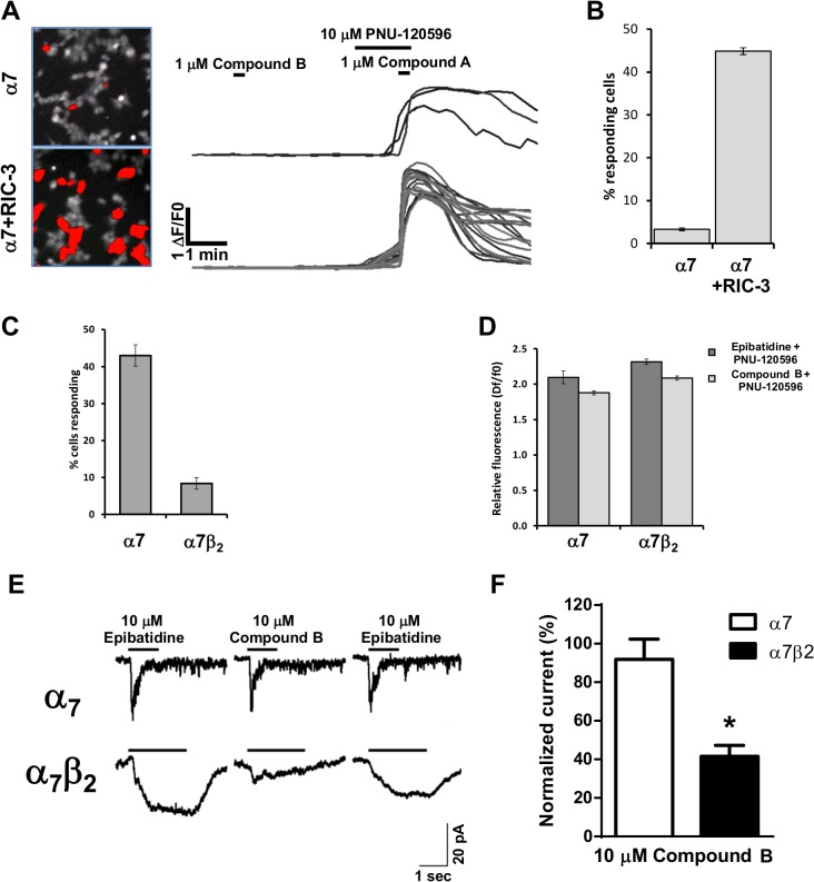 Fig 7. Responses of human α7 and α7β2 nAChRs to the nAChR agonists epibatidine and compound B and the modulator PNU120596 in HEK293 cells.A) Efficiency of α7 expression was determined as the number of regions of interest (outlined in red in the left panel images) showing a fluorescence increase above a threshold of 0.1 ΔF/F0 following application of compound B and PNU-120596. Representative single cell traces are shown for the two transfection conditions with α7 alone and the combination of α7 and RIC-3. B) Relative expression efficiency for the experiment described in A. C) Expression efficiency in HEK293 cells transfected with either α7 or α7β2 cDNA in the presence of RIC-3. D) The corresponding relative response amplitude for the two types of transfected cells obtained following co-application of either epibatidine (10 uM) or compound B (1 uM) and the α7 positive allosteric modulator PNU-120596 (10 uM). For data presented in panels A-D n = 3 for each experimental condition. E) Representative patch clamp recordings showing responses to the application of either epibatidine (10 M) or compound B (10 M) to cells expressing α7 (top traces) or α7β2 (bottom trace) receptors. F) Averaged normalized data for the traces shown in E corresponding to 3 cells (out of 8 recorded for the α7 and 13 recorded for the α7β2 transfected cells) that responded to the agonist application and were considered for analysis. Peak currents corresponding to application of compound B were normalised to the 1st epibatidine application. * P<0.05 indicates significant difference in an unpaired t-test.