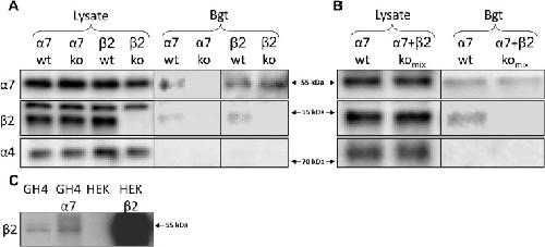 Fig 1. Bead-coupled α-bungarotoxin selectively purifies α7-containing nAChRs from mouse cortex.(A) Affinity purification was performed with bead-coupled α-bungarotoxin (α-Bgt) on cortical homogenates from α7+/+, α7-/-, β2+/+, and β2-/- mice and the isolated proteins were separated using gel electrophoresis. Subsequent detection using Western blotting demonstrated the presence of the α7 and β2 in the isolates from α7+/+ and β2+/+ mice. In isolates from α7-/- mice none of these proteins were detected, demonstrating that α-Bgt specifically isolates α7-containing nAChRs, and that the detection of β2 is dependent on the presence of α7 protein. In isolates from β2-/- mice, there was no detection of β2 protein, confirming the identity of the band isolated using α-Bgt as being β2. The α4 subunit was not detected in any of the isolates, confirming that the presence of β2 protein is not due to non-specific isolation of α4β2 nAChRs. In the original tissue lysates α7, β2, and α4 protein was readily detectable, except that β2 is not detected in β2-/- lysates, demonstrating the specificity of the antiserum. A 55 kDa protein was detected in both α7+/+ and α7-/- lysates, as has previously been shown for several other α7 antibodies [26,27]. (B) α-Bgt affinity purification on cortical homogenates from α7+/+ and a mixture of α7-/- and β2-/- mice. β2 subunits were not detected in the latter. (C) Detection of β2 is evident in HEK293 cells transfectd with the human β2 gene (HEK β2), but not in untransfected cells (HEK). Similarly transfection of GH4 cells with human α7 (GH4 α7) does not alter detection of the band corresponding to β2.