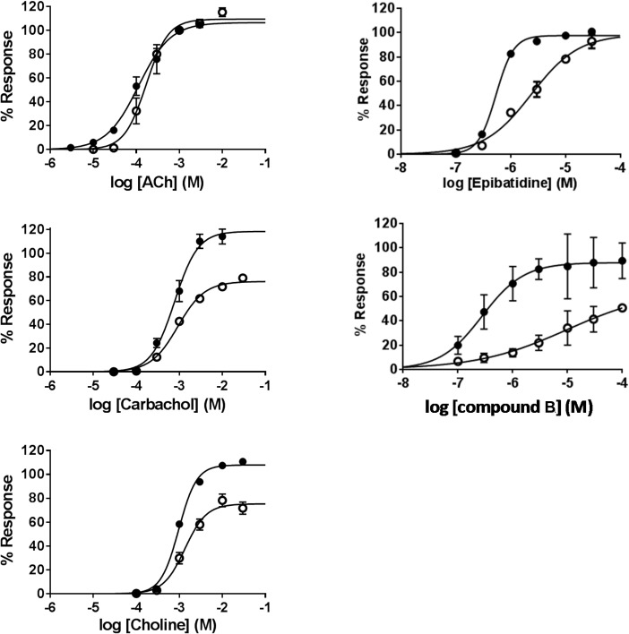 Fig 4. Concentration-response curves of nAChR agonists on human α7 and α7β2 nAChRs in Xenopus oocytes.Acetylcholine (ACh), carbachol, choline, epibatidine and compound B were applied in various concentrations to Xenopus oocytes expressing α7 (filled circles) and α7β2 (1:10, empty circles) nAChRs. All responses were normalized to the peak amplitude of a 1 mM control ACh-induced ion current in the respective oocyte.