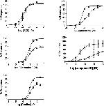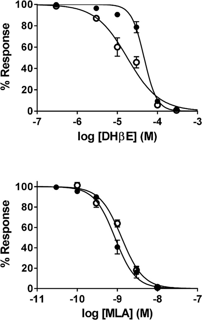 Fig 5. Effect of antagonists on human α7 and α7β2 nAChRs in Xenopus oocytes.Inhibition curves for dihydro-β-erythroidine (DhβE) and methyllycaconitine (MLA) on α7 (filled circles) and α7β2 (1:10, empty circles) nAChRs. Co-expression of α7β2 nAChR subunits lead to a significantly decreased IC50 for DhβE (P<0.01), and an increased IC50 for MLA (P<0.05) compared to α7 nAChR homomers.