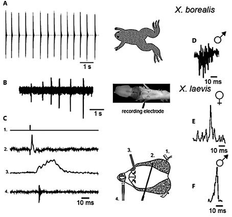 Fig. 6. Physiological bases of advertisement call production in X. borealis. A Sound oscillogram of the male X. borealis advertisement call. The call is a series of sound pulses repeated at ∼450-ms intervals. B 5-HT-evoked laryngeal nerve recordings from the isolated X. borealis brain reveal neural activity repeated at intervals similar to advertisement call sound pulse intervals (compare to A). C In the isolated X. borealis male larynx, a single laryngeal nerve stimulation (1.) elicits a laryngeal electromyogram (2.), which causes one laryngeal muscle contraction (measured by tension recordings, 3.) resulting in a single sound pulse (4.). D A single CAP recorded from the laryngeal nerve in a male X. borealis brain. X. borealis male CAPs more closely resemble the asynchronous X. laevis female CAPs (E) than the highly synchronous X. laevis male CAPs (F). A-D Adapted from Leininger and Kelley [2013]. E, F Adapted from Yamaguchi and Kelley [2000].