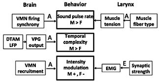 Fig. 7. A suite of hormonally controlled sex differences in the X. laevis vocal circuit contributes to vocal sex differences [reviewed in Zornik and Kelley, 2011]. Some behavioral traits - for example, sound pulse rate - rely both on brain and laryngeal mechanisms. Sex differences masculinize or feminize from a default juvenile state, in response to either androgens (A) or estrogens (E). Losses of these mechanisms are candidates for vocal evolution in species with reduced vocal sex differences, such as X. borealis.
