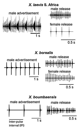 Fig. 3. Advertisement and release calls from X. laevis, X. boumbaensis, and X. borealis illustrate diversity in vocal sex differences in call complexity and IPI. In X. laevis (top), male advertisement and release call IPIs exceed those of females, and male calls are more temporally complex than female calls. X. boumbaensis (middle) and X. borealis (bottom) have temporally simplified male advertisement calls, with long IPIs. X. boumbaensis vocal sex differences are extreme, because females do not produce release calls. X. borealis vocal sex differences are reduced, as female and male release call IPIs do not differ significantly. Adapted from Leininger et al. [2015].