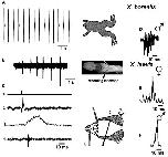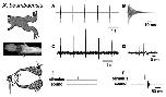 Fig. 5. Physiological bases of advertisement call production in X. boumbaensis. On the left, the preparation is indicated. The upper panel illustrates the calls; the middle panels show recordings from the laryngeal nerve (arrowhead) as it exits the brain; the lower panel illustrates results of electrically stimulating the laryngeal nerve (1.) and recording sounds (3.) produced by movements of the arytenoid disks (2.). A Sound oscillogram of the male X. boumbaensis advertisement call. The call is a series of sound pulses repeated at long (>1 s) intervals. B Enlargement of a single sound pulse. C 5-HT-evoked laryngeal nerve recordings from the isolated X. boumbaensis brain reveal neural activity repeated at call intervals (compare to A). D Enlargement of one instance of neural activity in C. Nerve activity is composed of compound action potential doublets. E Single stimuli delivered to the laryngeal nerve rootlets are not sufficient to cause sound pulse production. F Doublet stimuli approximating the temporal parameters of the compound action potential doublets is sufficient to produce a single sound pulse. Adapted from Leininger and Kelley [2013].