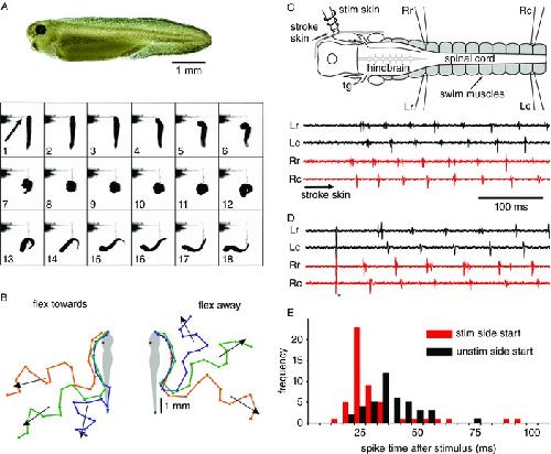 A, tadpole and video frames (150 frames sâ1) showing a tadpole viewed from above responding to touch on the left side of the head with a fine hair (arrow) by flexing to the left (frames 4â10) and then swimming off (frames 14â18). B, tracings from six similar videos after head stimulation on the left side (asterisk) plot head position to show flexion to left or right and swimming in a range of directions (arrows). C and D, an immobilized tadpole showing the brain, spinal cord and innervation of head skin by a sensory neuron in the trigeminal ganglion (tg). The positions of suction electrodes to record ventral root activity from swimming muscles (Rr, Rc, Lr, Lc) and to stimulate the right head skin are indicated. Fictive swimming can start on the stimulated side after touch (arrow, C) or current pulse (asterisk, D) stimulation to the head skin. E, histogram of latencies to the start of swimming in immobilized tadpoles following skin stimulation on the same (red bars) or opposite (black bars) side of the head. Bin size = 5 ms. |