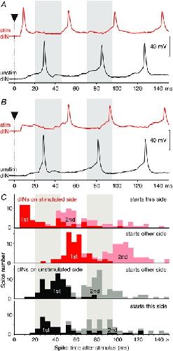 A and B, responses from a pair of dINs different from the one shown in Fig. 2. In each case, activity starts following a head‐skin stimulus (at arrowhead) and grey bars show the phase when spikes occur on the unstimulated side. A, the first dIN spike is at short latency on the stimulated side (red), whereas, in B, the first spike is later on the unstimulated side (black) and each is followed by the first spike on the other side. C, plots show spike occurrences on each side at different times after a stimulus to one side of the head (red and pink bars are the stimulated side; black and grey are the unstimulated side). Measures are from 230 responses in six dIN pairs. Bin size = 5 ms. |