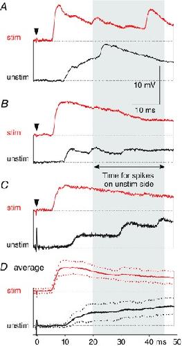 Asymmetry in EPSP responses to low‐level skin stimulation in dINs on stimulated (red) and unstimulated (black) sides