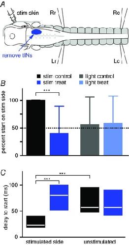 Effects of removing the tIN population on one side on swimming responses to head‐skin stimulation