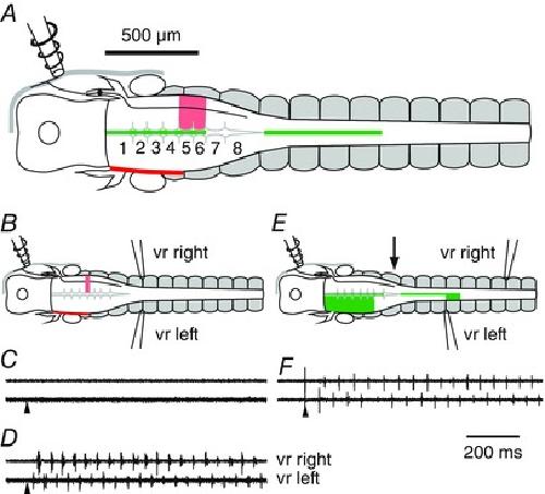 A, summary of regions of the hindbrain where unilateral transection prevented swimming (pink) or where mid‐line cuts (green) still allowed the initiation of bilateral swimming following a head‐skin stimulus applied to the right side (rhombomeres numbered). The trigeminal ganglia on the left side were severed to prevent contralateral sensory access (red line). B, example of a rostral unilateral transection (pink line). C, ventral root recordings show this lesion prevented swim initiation to a head‐skin stimulus (arrowhead) but not to a trunk‐skin stimulus (D). E, example of a mid‐line lesion (green line) that only left a short intact region of caudal hindbrain (arrow). F, this short intact region was sufficient to allow initiation of bilateral swimming following a head‐skin stimulus to the right side. Ventral root recording positions on right (upper traces) and left (lower traces) sides are indicated in B and E. |