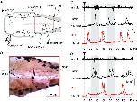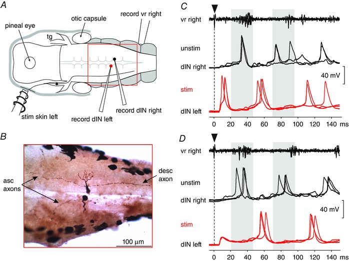 A, positions of recording and stimulating electrodes. B, photograph of a recorded pair of dINs on either side of the hindbrain (dorsal view, rostral to the left; red rectangle in A) with soma, dendrites and both ascending and descending axons. The descending axon of the left side dIN was damaged during the dissection (at*). C and D, each panel shows three overlain responses from the right ventral root and the pair of dINs shown in B. In each case, swimming starts following a left head‐skin stimulus (at arrowhead) and grey bars show the phase when spikes occur on the unstimulated side. C, the first dIN spike is at short latency on the left, stimulated side (red). D, there is a short‐latency EPSP in the left dINs but the first spike is later on the unstimulated right side (black) and is followed by the first spike on the stimulated side. |
