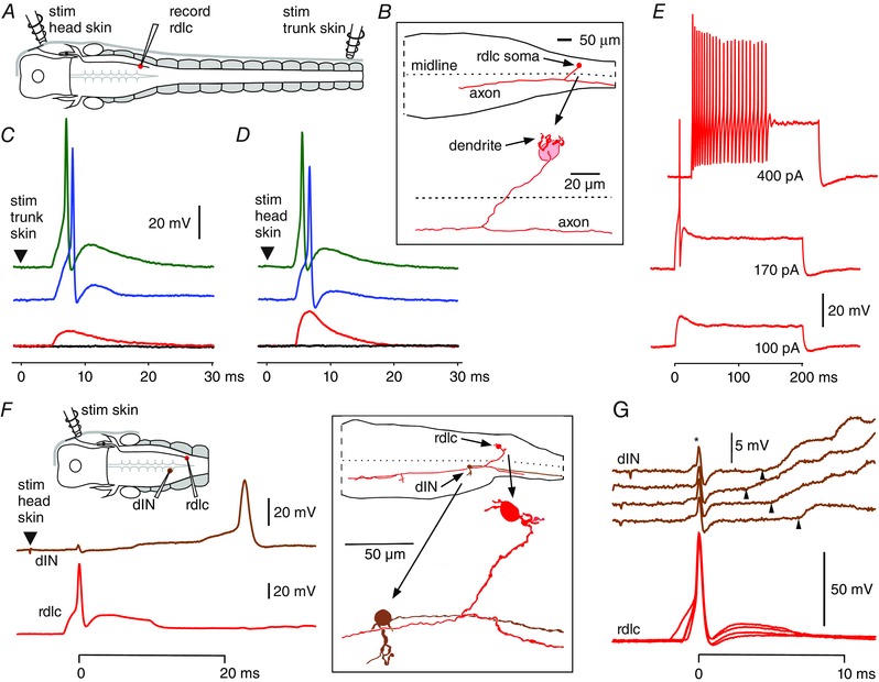 A, dorsal view showing the position of the stimulating and recording electrodes. B, rdlc neurobiotin filling showing the extent of the axon in hindbrain, with enlarged tracing of rdlc with soma, dendrites and axon crossing the mid‐line and ascending and descending on the contralateral side. C and D, traces showing rdlc response to ipsilateral trunk and head‐skin stimulation (arrowhead) of increasing strength from black = no response, red = EPSP alone, blue = spike, green = response to strong stimulus. E, current injected into an rdlc evokes a single spike at threshold and fast multiple firing at higher levels. F, showing the position of the electrodes for paired recording and a record of responses of rdlc and dIN to right head stimulus that starts swimming, as well as low and higher magnification tracings of the recorded cells in the box. G, responses of another rdlc/dIN pair to head‐skin stimuli, aligned by rdlc spikes to show EPSPs with variable delays (arrowheads) and shapes. Coupling artefact indicated by an asterisk (*). |