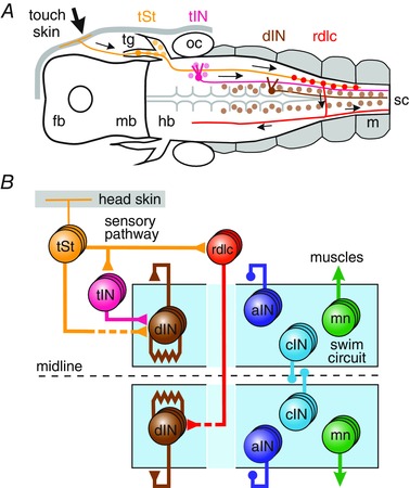 A, brain in dorsal view and the headâskin trigeminal pathways initiating swimming on the same or opposite sides. Dots show locations of the neuron populations, not their real numbers: touchâsensory trigeminal neurons (tSt, yellow), sensory pathway neurons (tIN, pale magenta; rdlc, red), electrically coupled reticulospinal excitatory neurons (dIN, brown). Fb, forebrain; hb, hindbrain; mb, midbrain; m, muscles; oc, otic capsule; sc, spinal cord; tg, trigeminal ganglion. B, functional diagram of the network including the central pattern generator (swim circuit) neurons: inhibitory interneurons (cIN, blue; aIN, purple) and motoneurons (mn, green). Continuous lines indicate evidence for a monosynaptic connection. Dashed lines indicate indirect connections (delay). Large circles represent populations of neurons. Small circles (inhibitory) and triangles (excitatory) are synapses and, when they contact a box, they connect to all neurons in the box. |