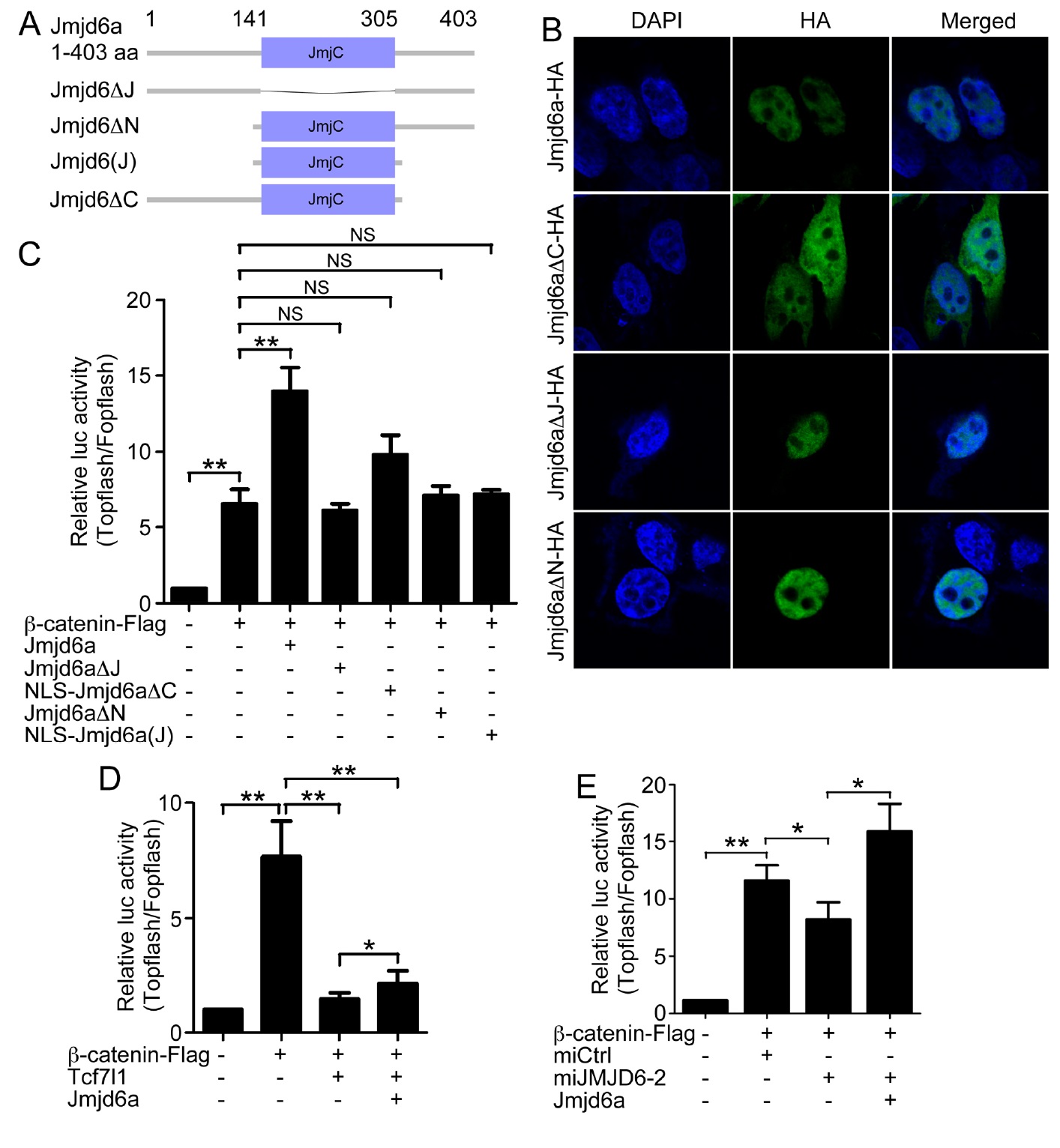 distributed ubiquitously throughout the whole cell. C, Jmjd6 enhanced strongly β-catenin-stimulated