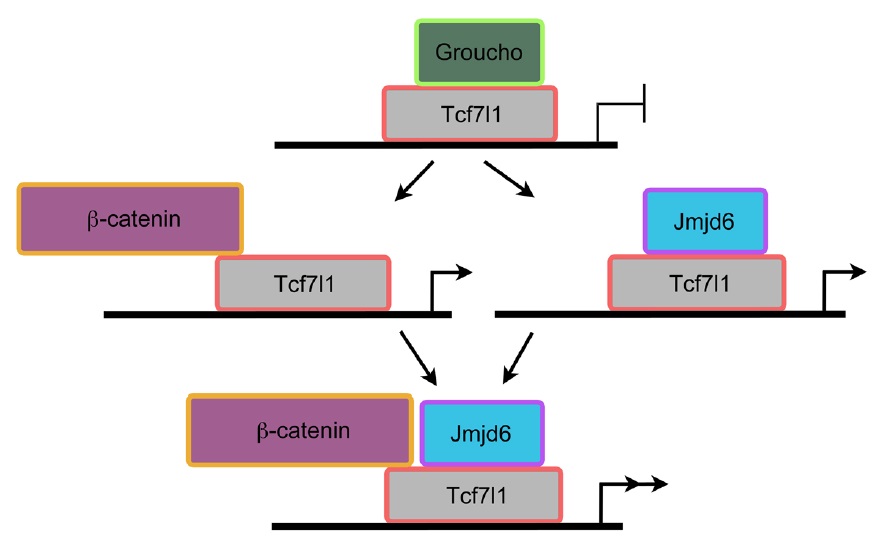 FIGURE 8. A model demonstrating the function of Jmjd6 in regulating the activity of Tcf7l1. In the