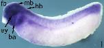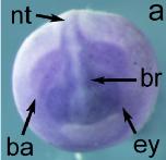 with the dorsal at the top of the panel; ba: branchial arch; bl: blastopore lip; br: brain; ey: eye; fb: