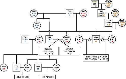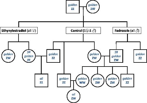 Fig. S1. Pedigree chart of the golden animals used in sex-reversal experiments (estradiol and fadrozole treatments). SR indicates sex-reversed individuals. |