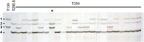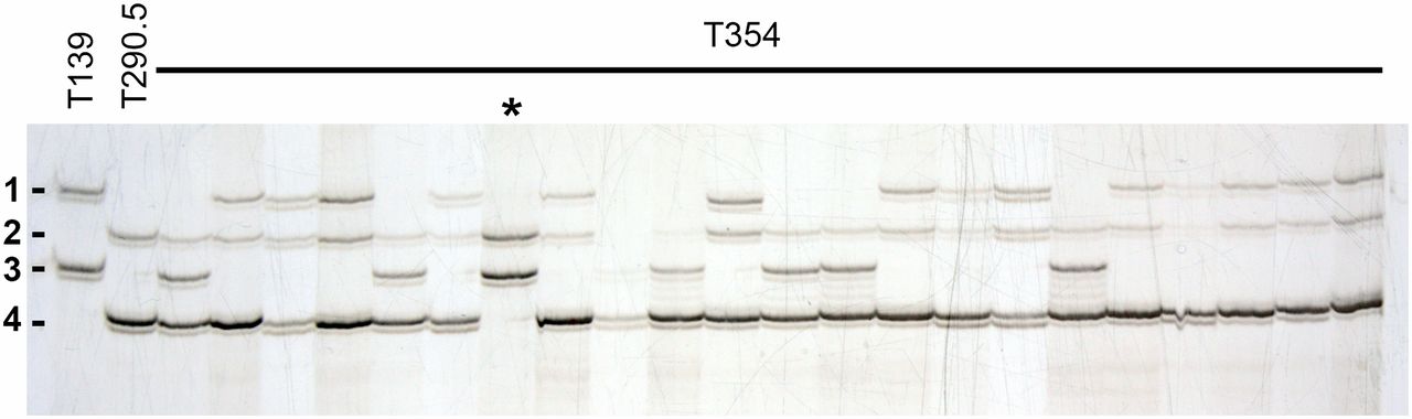 Fig. 3. Genotyping of triploid offspring. Triploid offspring are genotyped using polymorphic markers when both progenitors are heterozygous for different pairs of alleles (results for marker 033F11 are shown; see Table S1 for details). This type of marker allows identification of paternal (T139, heterozygous for alleles 1 and 3) and maternal (T290.5, heterozygous for alleles 2 and 4) contributions. Most triploid individuals (T354) will have three different alleles (one paternal and both maternal alleles), although triploids with two copies of one of the maternal alleles are also possible (*). The use of several markers differentiates diploids from triploids with two copies of the same allele. |