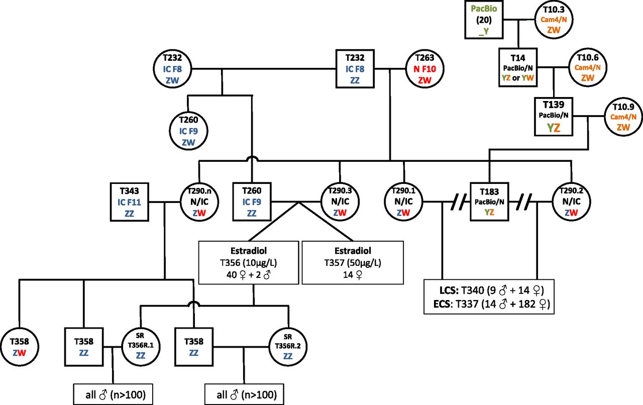 Fig. S2. Pedigree chart of the N/IC family used in estradiol sex-reversal and gynogenesis experiments. SR indicates sex-reversed individuals. Color coding refers to the strain the sex chromosomes come from: red, Nigerian; blue, Ivory Coast; Green, PacBio; orange, Cam4/N. |