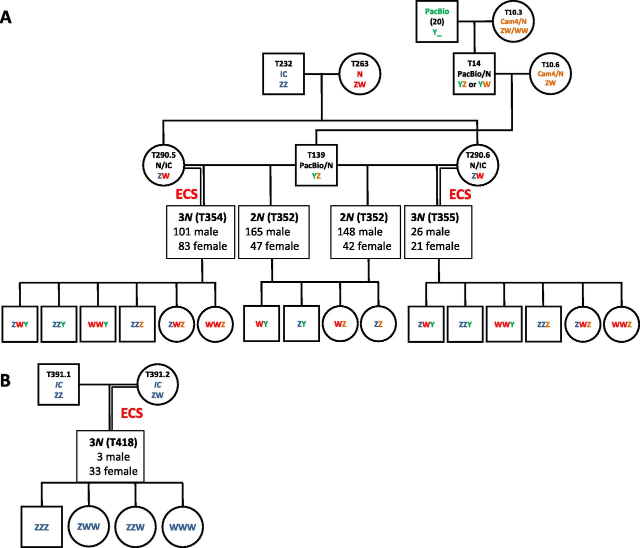 Fig. S3. Pedigrees and sex ratios of triploid and diploid siblings. (A) Pedigree and sex ratios of triploid and diploid siblings obtained from hybrid progenitors. The progenitors used in A were produced from interstrain crosses to obtain hybrids with high heterozygosity. The strain/stock of origin and proposed sex chromosome constitution are indicated (color-coded according to the strain/stock they come from; red: Nigerian; blue: Ivory Coast; green: PacBio; orange: Cam4/N hybrids). (B) Pedigree and sex ratios for triploids obtained from IC progenitors. The proposed sex chromosome constitutions are stated. |
