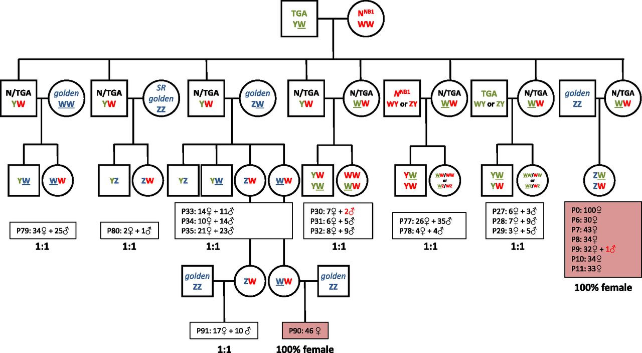 Fig. 4. Sex ratios and sex-linked marker inheritance in interstrain pairings prove the existence of Y, W, and Z sex chromosomes. The pedigree chart of the interstrain pairings performed shows the sex of the offspring obtained in different spawns (P0 to P91). All-female offspring were observed in two types of crosses (labeled in red), both involving golden ZZ males (obtained from breeding sex-reversed ZZ females with ZZ males). These offspring are possible only if the mothers are WW. Without sex reversal or gynogenesis, WW females can be produced only if males with a W chromosome (YW) are bred with ZW or WW females. Because all hybrid N/TGA females analyzed were WW, the sex chromosome constitution of the progenitors used to produce these hybrids was YW (TGA male) and WW (NNB1 female). Other TGA and NNB1 males used in this pedigree have a Y chromosome, although the data do not distinguish YZ from YW. The proposed sex chromosome constitution for all the animals in the pedigree chart is depicted together with a color code that indicates the strain or provenance (green: TGA; red: Nigerian; blue: golden). SR indicates a sex-reversed individual obtained by ethynylestradiol exposure (see pedigree chart in Fig. S1). |