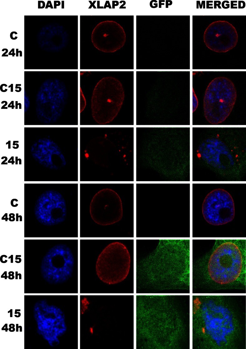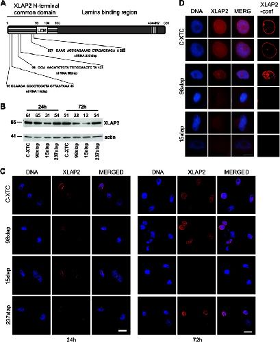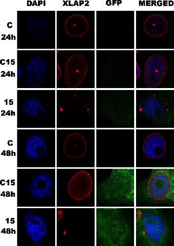 Chmielewska, Embryonic and adult isoforms of XLAP2 form microdomains associated with chromatin and the nuclear envelope. 2011, Pubmed , Xenbase