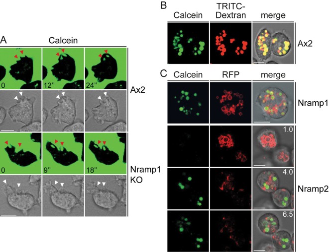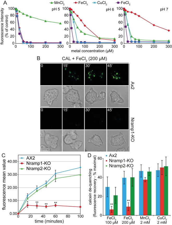 The Nramp (Slc11) protein family is widespread in bacteria and eukaryotes, and mediates transport of divalent metals across cellular membranes. The social amoeba Dictyostelium discoideum has two Nramp proteins. Nramp1, like its mammalian ortholog (SLC11A1), is recruited to phagosomal and macropinosomal membranes, and confers resistance to pathogenic bacteria. Nramp2 is located exclusively in the contractile vacuole membrane and controls, synergistically with Nramp1, iron homeostasis. It has long been debated whether mammalian Nramp1 mediates iron import or export from phagosomes. By selectively loading the iron-chelating fluorochrome calcein in macropinosomes, we show that Dictyostelium Nramp1 mediates iron efflux from macropinosomes in vivo. To gain insight in ion selectivity and the transport mechanism, the proteins were expressed in Xenopus oocytes. Using a novel assay with calcein, and electrophysiological and radiochemical assays, we show that Nramp1, similar to rat DMT1 (also known as SLC11A2), transports Fe(2+) and manganese, not Fe(3+) or copper. Metal ion transport is electrogenic and proton dependent. By contrast, Nramp2 transports only Fe(2+) in a non-electrogenic and proton-independent way. These differences reflect evolutionary divergence of the prototypical Nramp2 protein sequence compared to the archetypical Nramp1 and DMT1 proteins.