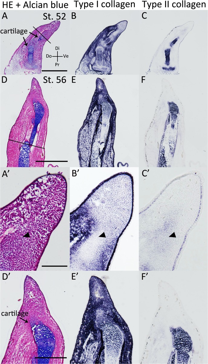 Fig 5. Type I and Type II collagen expression patterns in Xenopus stage 52 and stage 56 limb bud blastemas.(A-C) On day 10 following zeugopod amputation at st. 52 limb bud. (A) HE and Alcian blue staining. (B) Type I collagen expression. Type I collagen expression was weak in the distal region. (C) Type II collagen expression. (D-F) On day 10 following zeugopod amputation at st. 56 limb bud. (D) HE and Alcian blue staining. (E) Type I collagen expression. Type I collagen expression was observed throughout the entire mesenchymal region. (F) Type II collagen expression. A-C are shown at the same magnification. D-F are shown at the same magnification. Aâ-Fâ are higher magnification images of A-F, respectively. Scale bars in A, D, Câ, Dâ, are 200 μm, 500 μm, 1 mm, 250 μm, respectively. Black bars indicate amputated planes. Arrowheads indicate estimated cartilage forming areas.
