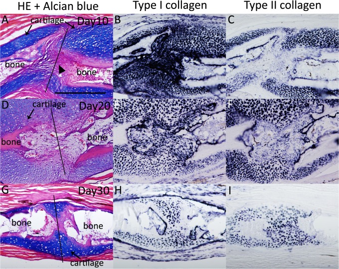 Fig 7. Type I and type II collagen expression patterns during Xenopus fracture healing.(A-C) The Xenopus fracture at 10 days postwounding. A cartilaginous callus was observed in the bone wound plane. (A) HE and Alcian blue staining. (B) Type I collagen-expressing cells were observed at the bone wound site. (C) The type II collagen expression area was smaller than the type I collagen expression area. (D-F) The Xenopus fracture at 20 days postwounding. (D) HE and Alcian blue staining. (E) Type I collagen expression. (F) Type II collagen expression. (G-I) The Xenopus fracture at 30 days postwounding. (G) HE and Alcian blue staining. (H) Type I collagen expression. (I) Type II collagen expression. All panels are shown at the same magnification. Scale bar is 200 μm. Black bars indicate amputated planes. Arrowheads indicate the gap of the amputated bone.