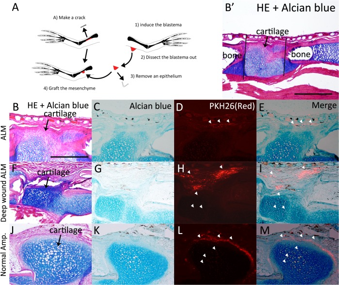 Fig 9. Xenopus ALM blastema cells do not have cartilaginous differentiation capacity.(A) The scheme of the experiment. (B-E) Xenopus ALM blastema cells were grafted to the bone wound site. (B) HE and Alcian blue staining. Bâ is a lower magnification image of B. Black lines indicate bone crack area. (C) Alcian blue staining. The cartilaginous callus was visualized by Alcian blue stain. (D, E) Grafted cells were PKH26-positive (red). PKH26-positive cells were not observed in cartilaginous callus. White arrow heads indicate PKH26-positive cells. (F-I) Deep wound ALM blastema cells were grafted to the bone wound site. (F) HE and Alcian blue staining. (G) Alcian blue staining. (H, I) Grafted cells were observed in the cartilaginous callus. (J-M) Control experiment. Normal blastema cells were grafted to the bone wound site. (J) HE and Alcian blue staining. (K) Alcian blue staining. (L, M) Grafted cells were observed in the cartilaginous callus. B-M are shown at the same magnification. Scale bar in B is 200 μm. Scale bar in Bâ is 500 μm.