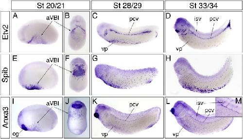 Fig 1. Anxa3 is expressed in endothelial and myeloid cells of developing Xenopus laevis embryos.Whole-mount in situ hybridization analysis of Etv2, SpiB and Anxa3 transcripts in Xenopus embryos at stages (St) 20/21, 28/29 and 33/34 (A-M). Lateral (A,C,D,E,G,H,I,K,L) and ventral (B,F,J) views show a close association of Anxa3 with the developing endothelial (Etv2) and myeloid (SpiB) lineages. At early stages (I,J), Anxa3 is expressed in the anterior ventral blood island (aVBI), which consists of adjacent Etv2 (A,B) and SpiB (E,F) expressing cells. At St 28/29 and 33/34, Anxa3 (K,L) is detected in the major vascular structures highlighted by Etv2 expression (C,D): the posterior cardinal vein (pcv), vascular plexus flank (vp) and intersomitic vessels (isv). (M) High magnification view of an embryo showing strong expression of Anxa3 in the pcv and isv. Anxa3 is also observed in the myeloid cells (marked by SpiB) that migrate throughout the entire embryo (compare the G,H to K,L). Throughout development, Anxa3 is also present in the cement gland (cg). |