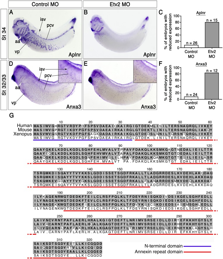 Fig 2. Anxa3 is expressed in Etv2-dependent endothelium.Analysis of Aplnr and Anxa3 expression in embryos injected with 25 ng of control (A,D) and Etv2 (B,E) MOs (stage 32â34, lateral views). (A,B) Etv2 MO blocks expression of the vascular marker Aplnr, as compared to control MO treated embryos. (C) Graphical representation of the percentage of control and Etv2 MO injected embryos showing reduced vascular expression of Aplnr. (D,E) Vascular expression of Anxa3 is lost in Etv2 MO injected embryos but retained in control MO injected embryos. Insets are higher magnification views centered on the developing posterior cardinal vein (pcv) and intersomitic vessels (isv). Notice that Anxa3 transcripts are present in myeloid cells in both control and Etv2 morphants. (F) Graphical representation of the percentage of control and Etv2 MO injected embryos showing reduced vascular expression of Anxa3. aa, aortic arches (white arrowhead); vp, flank vascular plexus. (G) Amino acid sequence alignment of human, mouse, Xenopus ANXA3 and zebrafish ANXA3(a) and ANXA3(b) proteins (MacVectorâdark shading indicates identity and light shading indicates similarity of amino acids). The N-terminal domain is underlined in blue and the Annexin repeat domains (4) are underlined in red. |