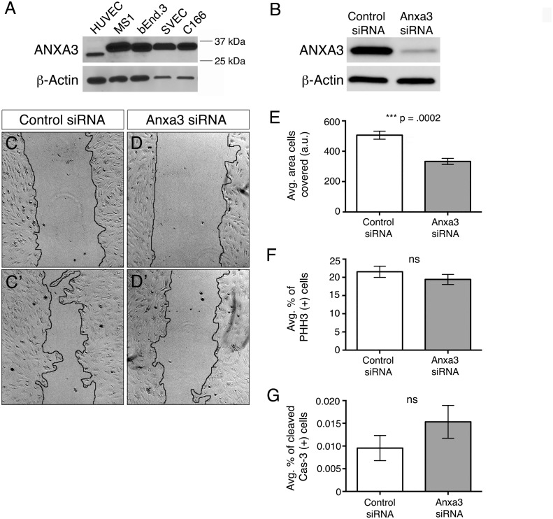 Fig 4. Loss of Anxa3 function in vitro results in aberrant cellular behavior.(A) Western blot analysis of ANXA3 protein levels in human (HUVEC) and mouse endothelial cell lines (MS1, bEnd.3, SVEC and C166). The ANXA3 antibody consistently recognized a protein in HUVEC, at the approximate predicted size (36 kDa), that was slightly smaller than mouse ANXA3. β-Actin was used as a loading control. (B) Western blot analysis of ANXA3 in HUVECs treated with control and Anxa3 siRNAs (35 μM) showed dramatic reduction in Anxa3 protein levels as normalized to β-Actin. (C-D’) Scratch assay results of control (C,C’) and Anxa3 (D,D’) siRNA treated HUVECs at 0 (C,D) and 24 (C’,D’) hours post scratch. EC-free areas are outlined in black. (E) Quantification of the EC-free area within the scratch assays, as determined by ImageJ in arbitrary units (a.u.). Note the significantly reduced repopulation of the wound by Anxa3 siRNA treated ECs. (F,G) Control and Anxa3 siRNA treated HUVECs were analyzed for rates of cell proliferation and death by immunofluorescent staining with Phospho-Histone H3 (PHH3) and Cleaved Caspase-3 (Cas-3), respectively, and presented in graphical form. No significant (ns) changes were observed. (E-G) Data are presented as the standard error of the mean, SEM. |