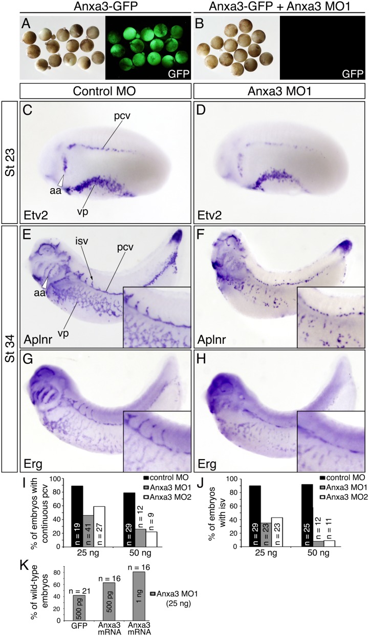 Fig 5. Anxa3 MO treated embryos fail to undergo proper blood vessel morphogenesis.(A,B) Anxa3 MOs efficiently block translation of a control transcript consisting of the Anxa3 5’UTR fused to the coding region of green fluorescent protein (GFP). Injection of this mRNA results in GFP expression in the embryo, however co-injection with Anxa3 MO blocks GFP translation. (C-H) Whole-mount in situ hybridization analysis (lateral views) on control MO and Anxa3 MO1 (25 ng) injected embryos. (C,D) At stage (St) 23, control and Anxa3 MO treated embryos show grossly similar expression levels of the EC differentiation marker Etv2. (E-H) At St 34, major vascular defects were visualized by in situ hybridization for Aplnr and Erg expression. Anxa3 morphants display non-continuous vessels and rarely form intersomitic vessels (isv) or aortic arches (aa). Insets show high magnification views of the posterior cardinal vein (pcv) and isv region. Notice in some cases (F), ECs appear unattached but aligned in the proper location. (I, J) Categorization of two non-overlapping Anxa3 MO (MO1 and 2) phenotypes compared to control MO treated embryos (St 34). Embryos injected with either non-overlapping Anxa3 MO seldom form isv and continuous, organized pcv. n, number of embryos assayed. (M) Anxa3 MO1-induced phenotypes (discontinuous pcv, unorganized vp and loss of isv and aa), as assessed by in situ hybridization for Aplnr transcripts (S2 Fig) and presented in graphical form, can be rescued in a dose dependent manner by co-injection of Anxa3 mRNAs. |