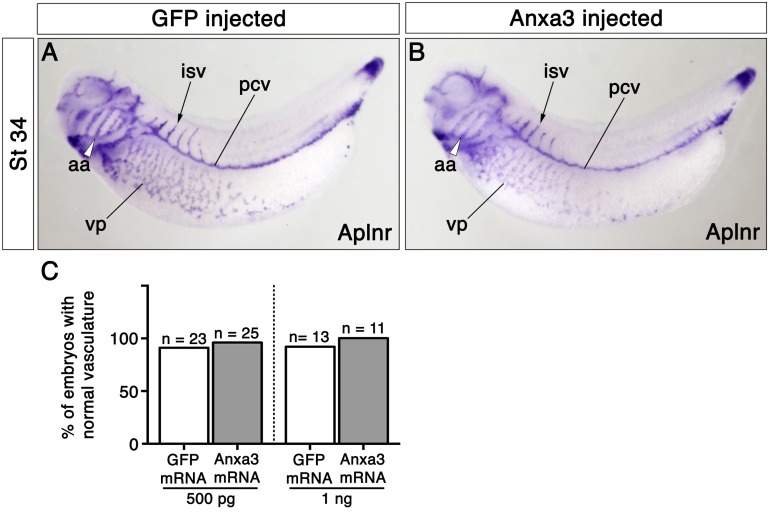 Fig 6. Anxa3 gain-of-function has no effect on developing blood vessels in vivo.(A,B) Whole-mount in situ hybridization for Aplnr expression in GFP and Anxa3 mRNA injected embryos (stage 34, lateral views). No changes in overall vessel morphology or levels of Aplnr expression were observed. (C) The percent (%) of GFP and Anxa3 mRNA injected embryos displaying normal vascular formation, as assessed by Aplnr expression, are shown. Aortic arches, aa; intersomitic vessel, isv; n, number of embryos assayed; posterior cardinal vein, pcv and vascular plexus, vp. |