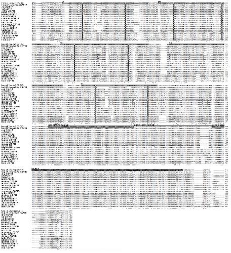Fig. 1. Amino acid alignment of X. laevis CSF1R with other vertebrate CSF1R protein sequences. Protein alignments were performed using ClustalW2 server. Fully conserved residues are indicated by an asterisk (*), partially conserved and semi-conserved substitutions are represented by “:” and “.”, respectively. The X. laevis CSF1R signal peptide is in bold, the immunoglobulin-like domains are indicated as D1-D5, the evolutionarily conserved structural cysteines are in white text within black boxes and the transmembrane domain is also in bold face. As indicated overhead; the X. laevis CSF1R ATP binding and tryrosine kinase major catalystic domains are in white text within black boxes while the kinase insert domain is indicated by an overhead line.